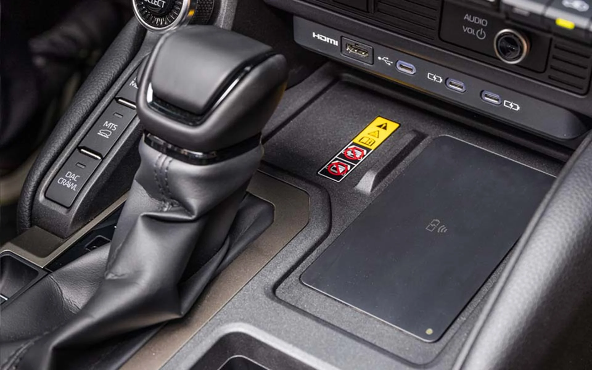 Front Wireless charger and charging port USB-C in all 3 rows to serve all passengers